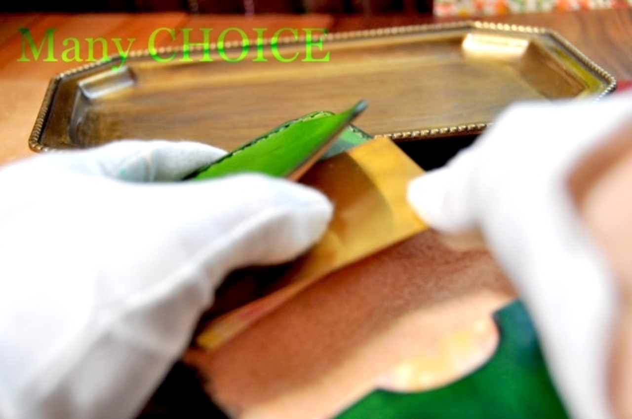 コバ面は磨き・焼きこみ・蠟引き、ワックスを繰り返し施し、時間をかけて、磨き上げていきます。