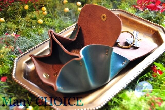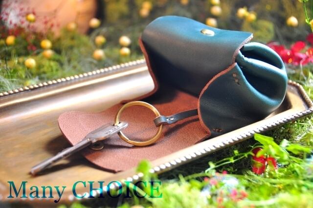 一つのポケットのところに鍵を入れられるように革紐と二重リングをつけて、キーケースと小銭入れを一体化しました。