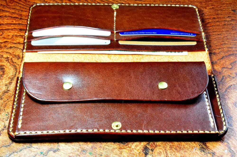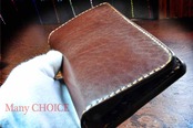 コバ面は磨き・焼きこみ・蠟引き、ワックスを繰り返し施し、時間をかけて、磨き上げていきます。コバにも、染色して、磨き上げています。