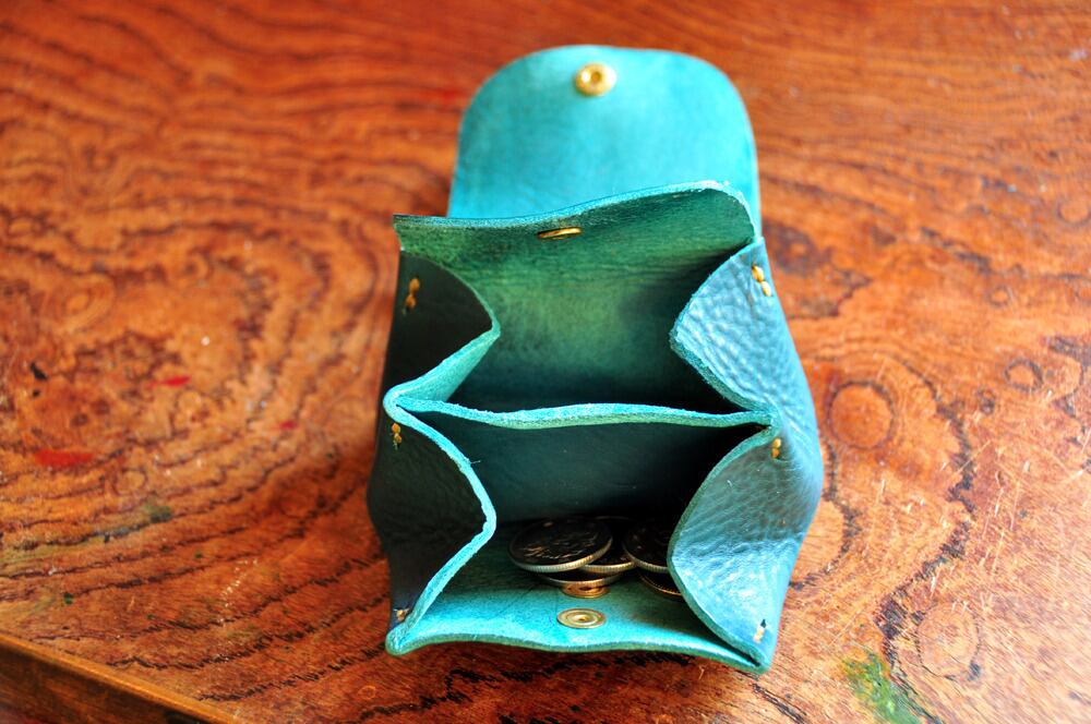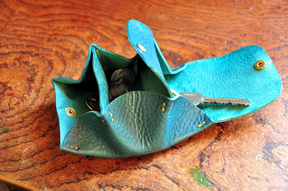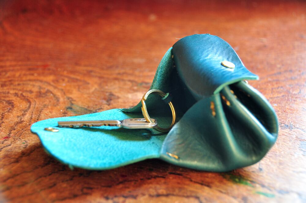 一つのポケットのところに鍵を入れられるように革紐と二重リングをつけて、キーケースと小銭入れを一体化しました。