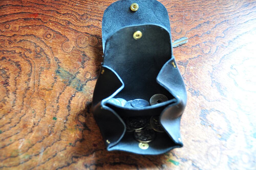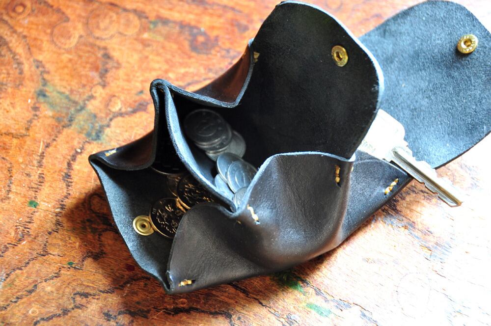 一つのポケットのところに鍵を入れられるように革紐と二重リングをつけて、キーケースと小銭入れを一体化しました。