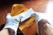 コバ面は磨き・焼きこみ・蠟引き、ワックスを繰り返し施し、時間をかけて、磨き上げていきます。